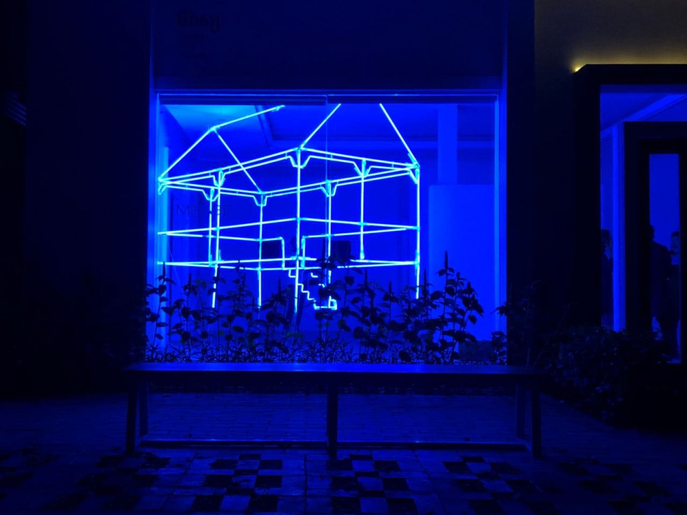 ស្នាដៃសិល្បៈគំនូរបង្គុំអំពូលភ្លើងណេអុង ៦ផ្ទាំង និងចម្លាក់១ របស់សិល្បករជនជាតិខ្មែរលោក វុធ លីណូ កំពុងបំភ្លឺក្នុងវិចិត្រសាលមួយនាក្រុងអង្គរសៀមរាបរយៈពេល៣ខែ ដែលមានឈ្មោះថា «សាលាសំណាក់»។