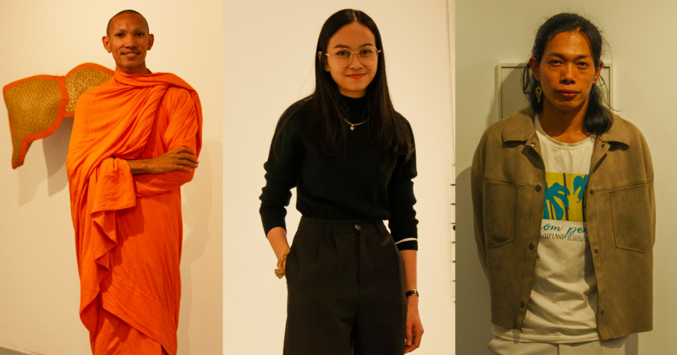 (ឆ្វេងទៅស្តាំ) សិល្បករ សួង ភភ្តីុ, ឡេង គឹមស្រៀង និងគង់ តារា ដែលរួមគ្នាដាក់តាំងបង្ហាញស្នាដៃសិល្បៈ «សាងជាថ្មី»