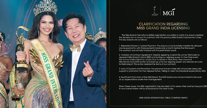 ថ្មីៗនេះ ដោយឃើញមានព័ត៌មានជាច្រើនកើតឡើងមិនចេះចប់ជាមួយសកម្មភាពមួយចំនួនតាំងពីចាប់ប្រកួត រហូតរកឃើញម្ចាស់ម្កុដថ្មី MGI ២០២៤ ដែលបានទៅលើប្រទេសឥណ្ឌា ។ ស្រាប់តែប៉ុន្មាននាទីមុននេះ ស្ថាប័ន Miss Grand India បញ្ជាក់ពីមូលហេតុ នៅពីក្រោយការសម្រេចចិត្ត មិនបន្តកុងត្រា ជាមួយម្ចាស់អាជ្ញាប័ណ្ណ Miss Grand International (MGI)មុននេះ។ មូលហេតុសំខាន់ៗមានដូចខាងក្រោម៖